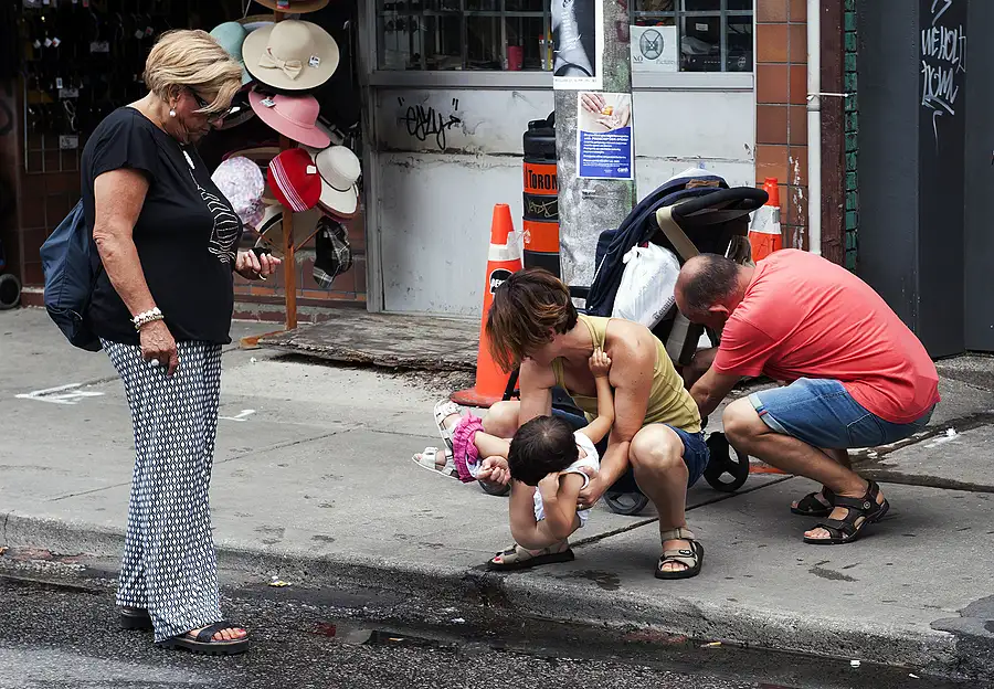 I was on my way to meet a photobud in the Market when I noticed a mother squatting over the edge of the sidewalk, holding her young daughter who was urinating on the sidewalk and road, while the father rummag
