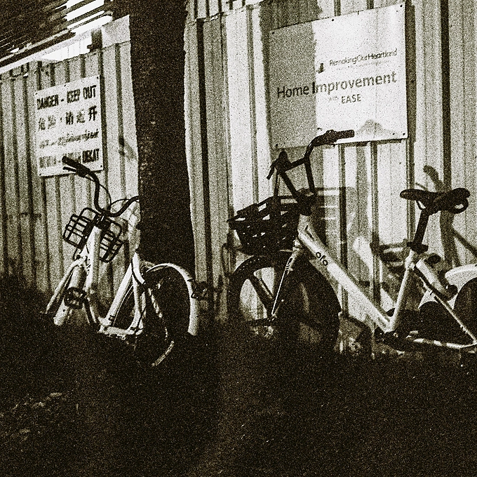 Parked bikes at night
