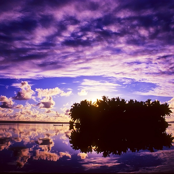 dawn over islet in lake