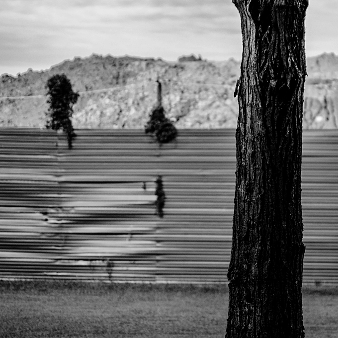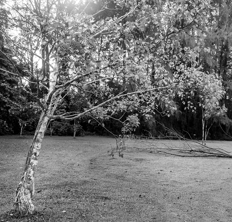 A tree stands guard over the destruction