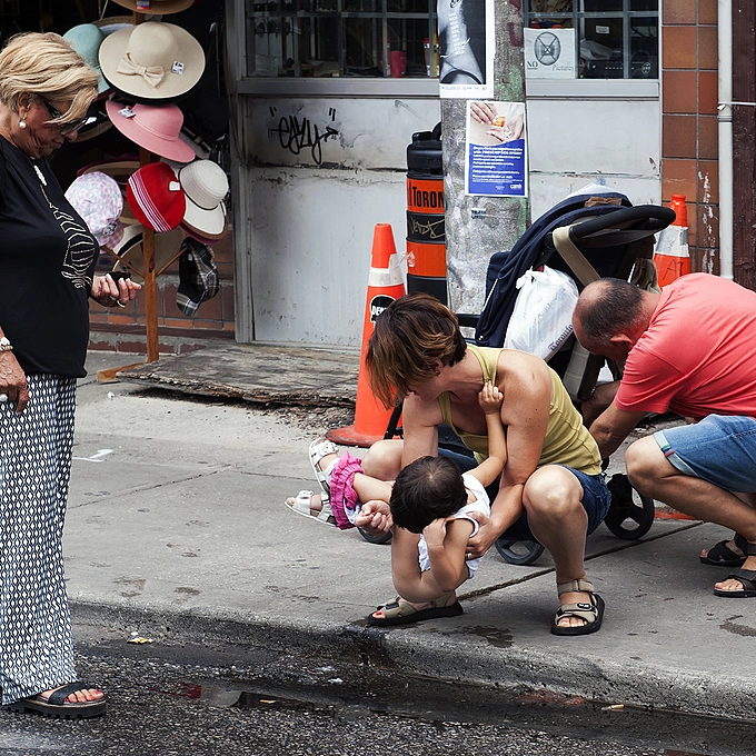 I was on my way to meet a photobud in the Market when I noticed a mother squatting over the edge of the sidewalk, holding her young daughter who was urinating on the sidewalk and road, while the father rummag