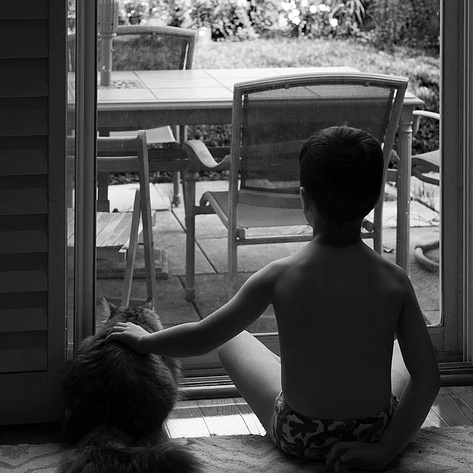 Early in the morning while one of our cats was sitting by the window eyeing the birds in the yard, Evan sat down beside him, and I grabbed this shot. Converted to black and white in Photoshop.