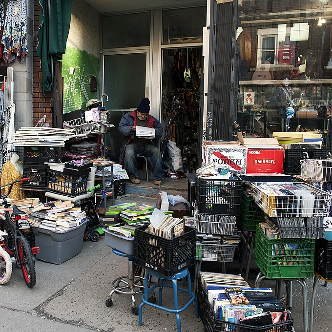 I've been bad for the last six or seven months and haven't been shooting much at all. Last Sunday, I was downtown and waiting for my wife and grand-daughter so I went to Kensington to kill time and walked around. I passed one of the neighbourhood stores that deals in used goods of every description. The owner always brings a ton of merchandise out onto the sidewalk, and then spends the day sitting on the doorstep reading the paper. I liked the story, and grabbed this shot.
