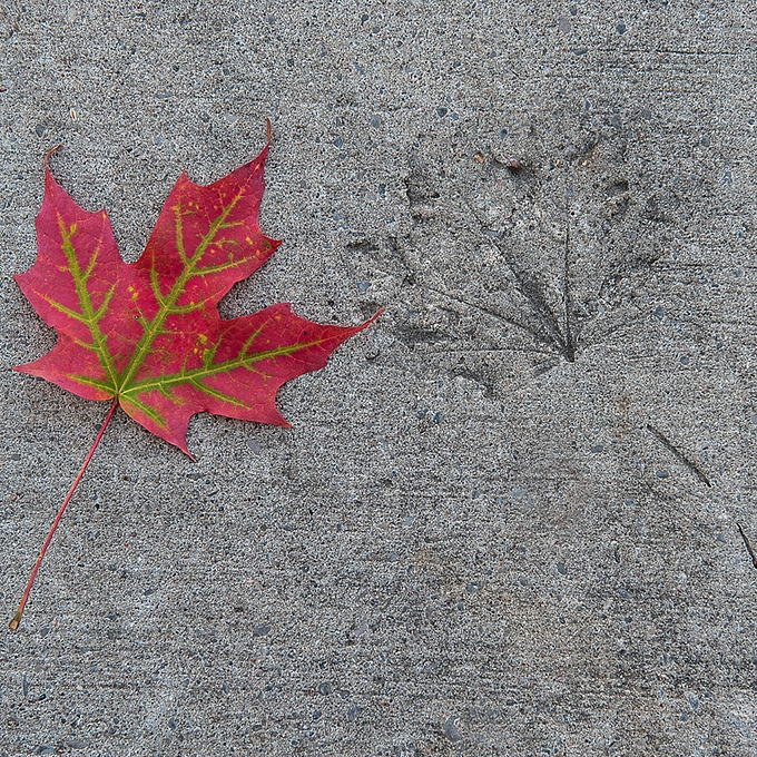 As part of my rehab. from my right hip replacement at the end of August, I've been walking two miles a day One day, while walking, I noticed a fossilized impression of a maple leaf in the concrete sidewalk, and when the leaves turned, drove back to the spot with my gear, arranged this composition and grabbed this shot