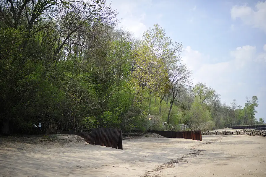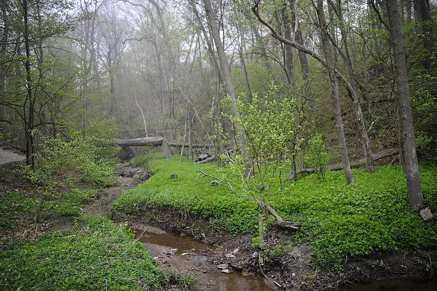 Des Plaines River in spring flood, drizzle