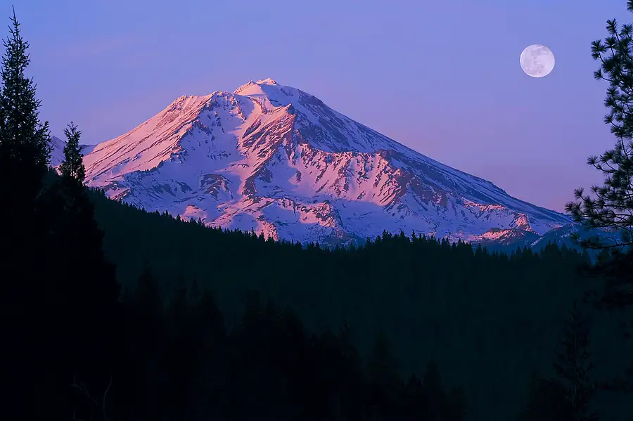 Moonrise and Sunset over Mount Shasta