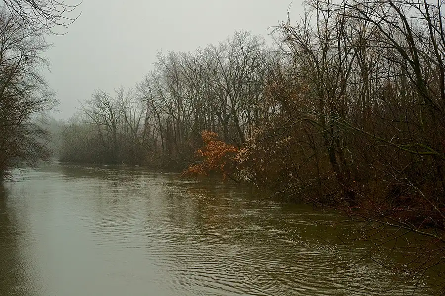 Des Plaines River in spring flood, drizzle